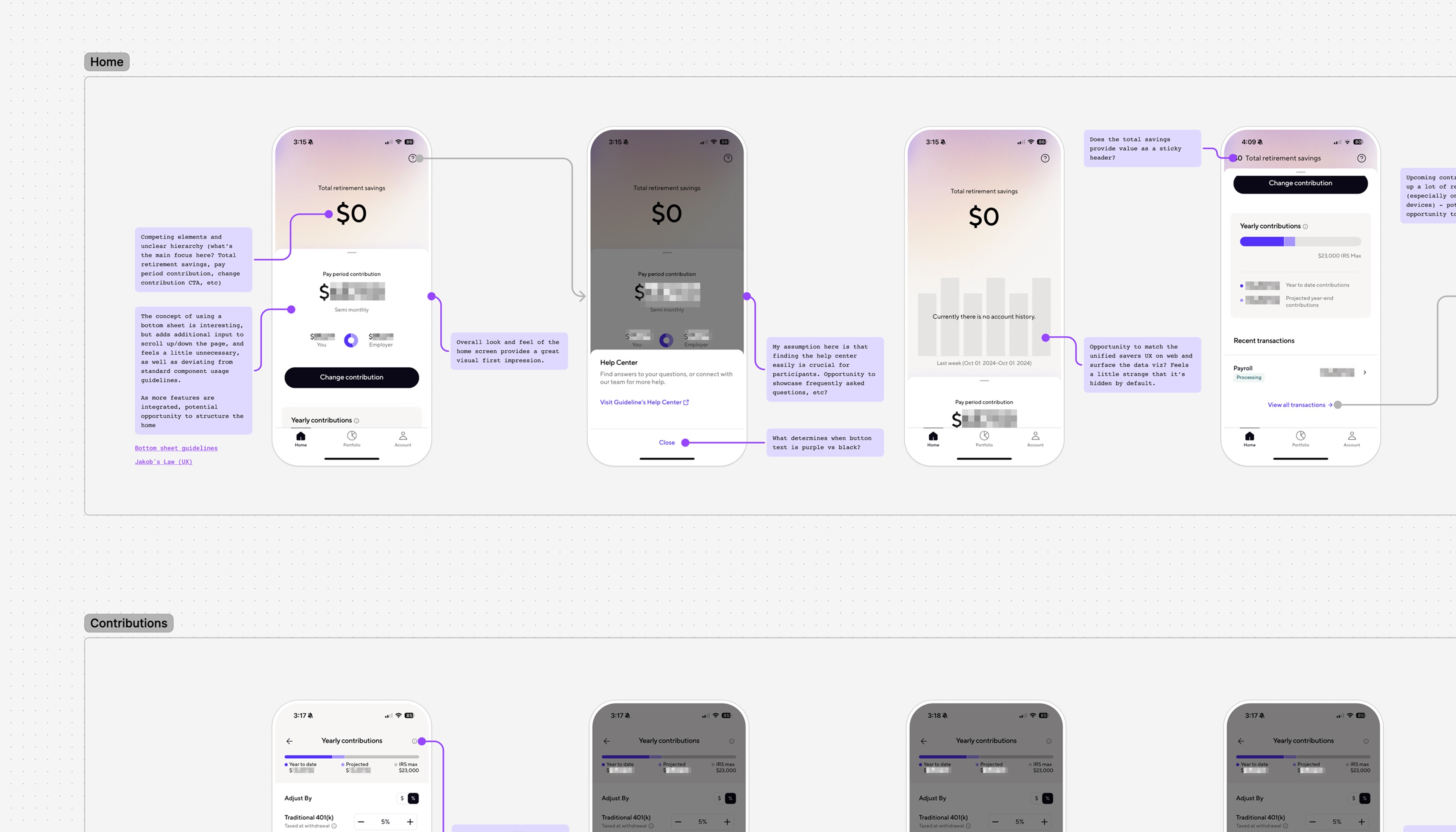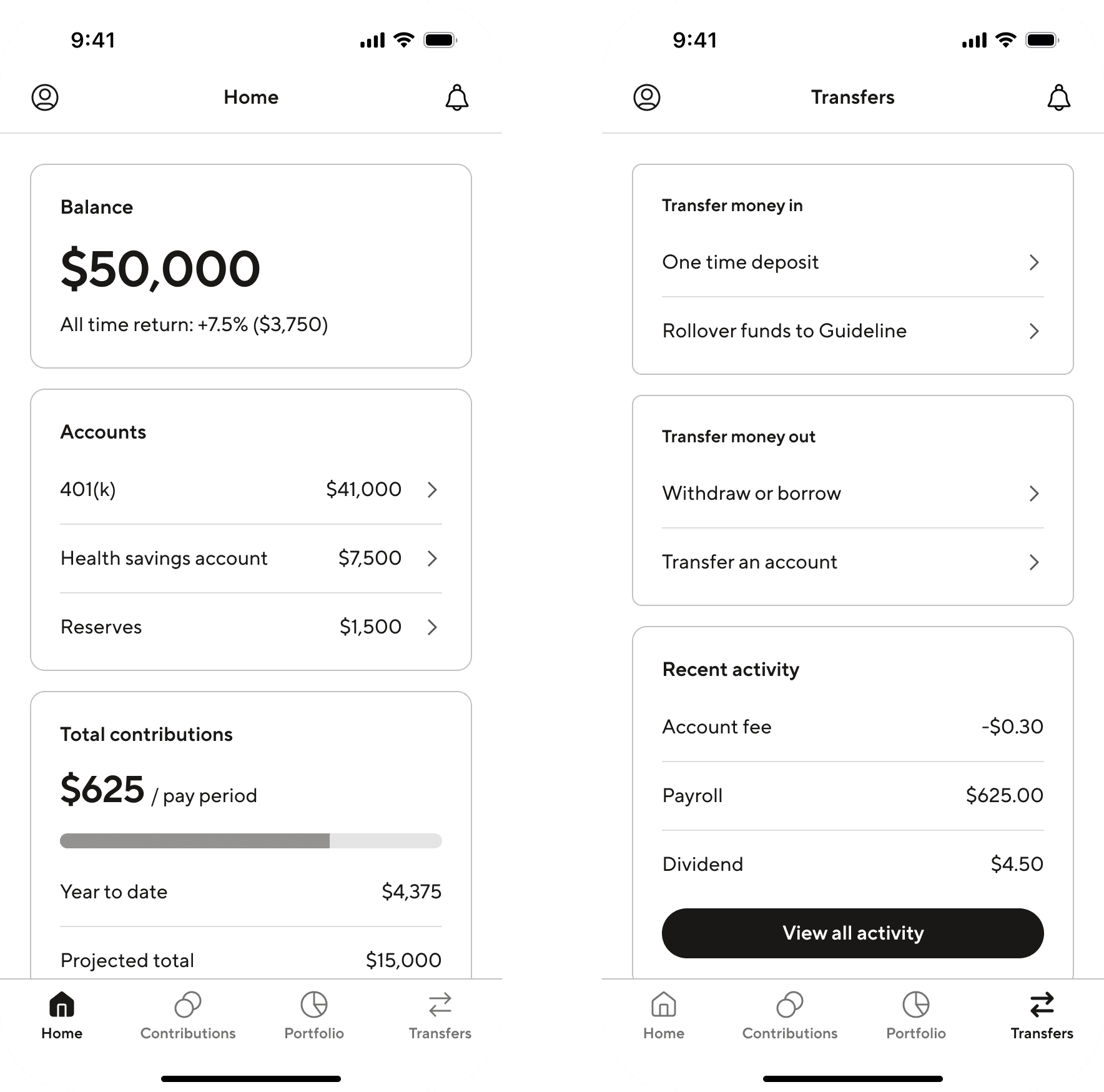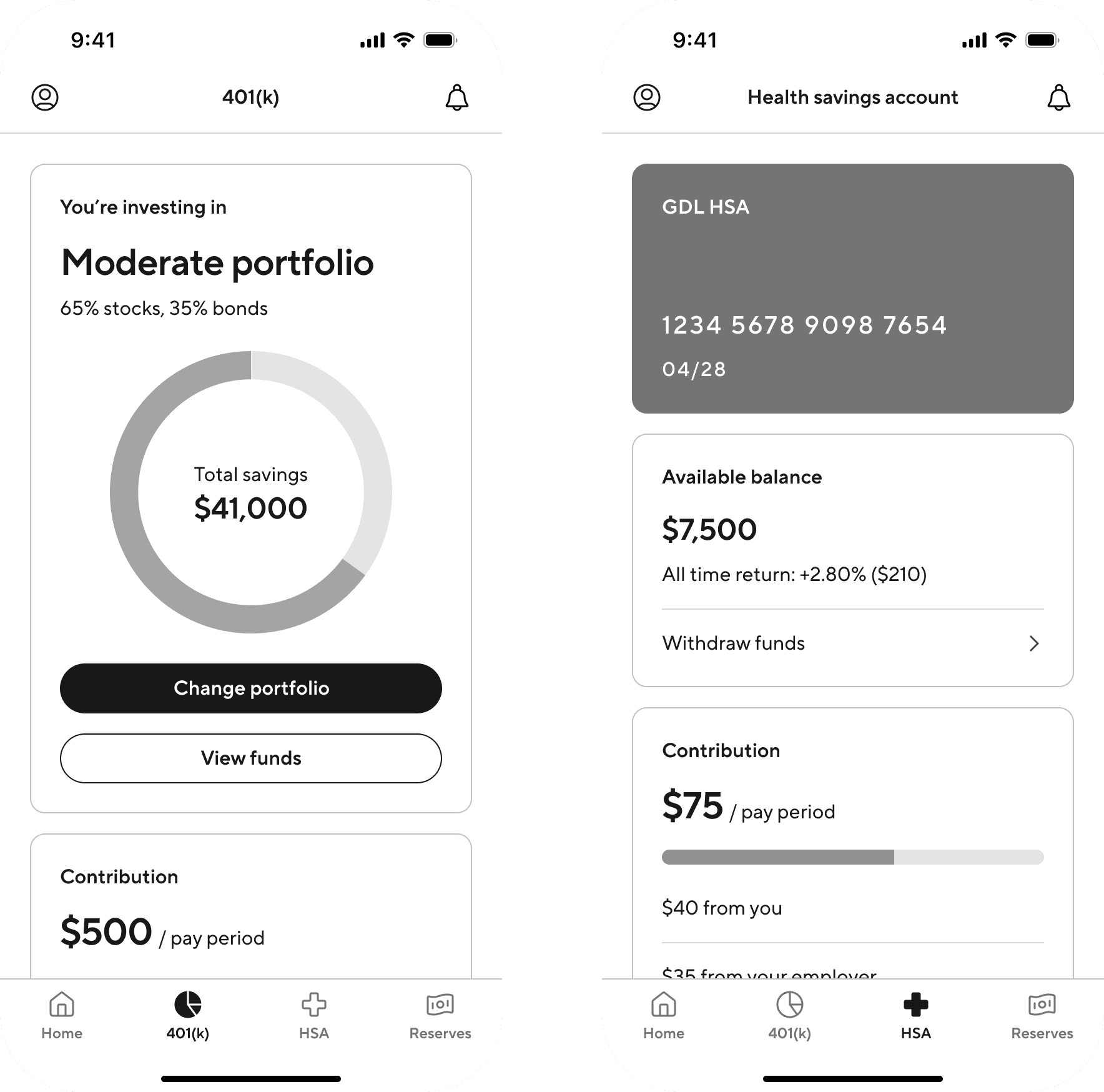 As part of this expansion, we re-evaluated the mobile navigation structure in anticipation of future product growth. I ran an unmoderated usability study comparing two bottom navigation models: one, web parity, aligned with our web product and organized around actions (Home, Contributions, Portfolio, Transfers), and another, product-centric, structured around individual products on the roadmap (Home, 401(k), HSA, Reserves). Eight of nine participants preferred the web-parity model, citing that action-based navigation felt more intuitive and appreciated having multiple paths to complete tasks.