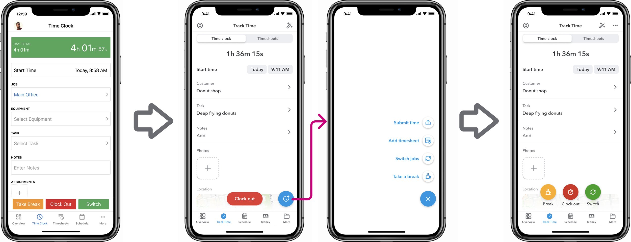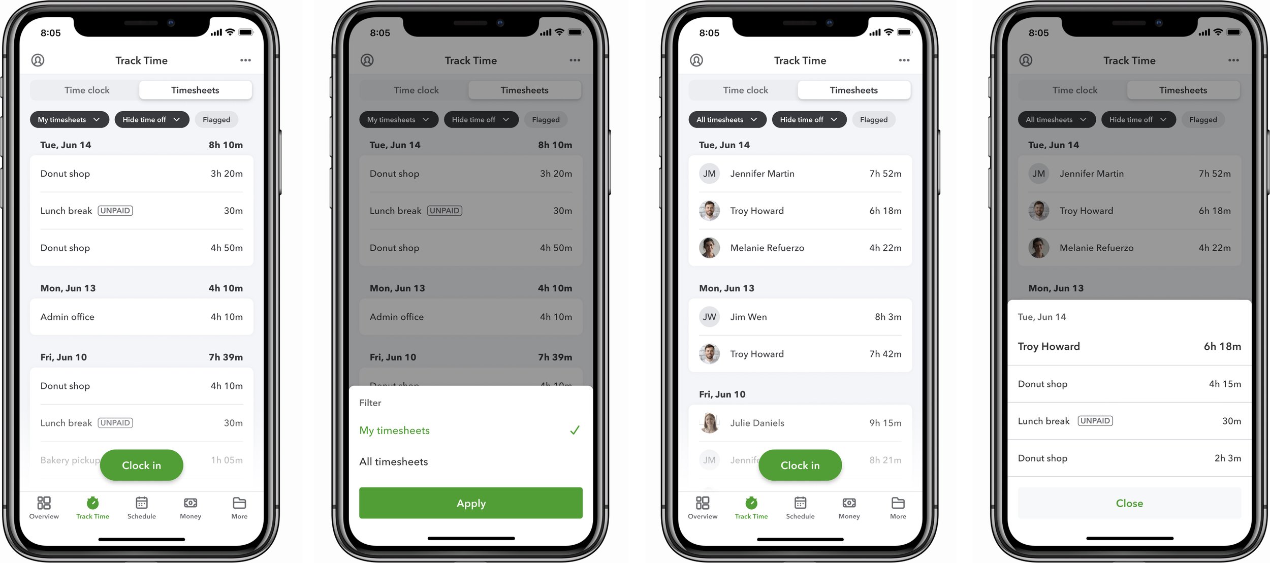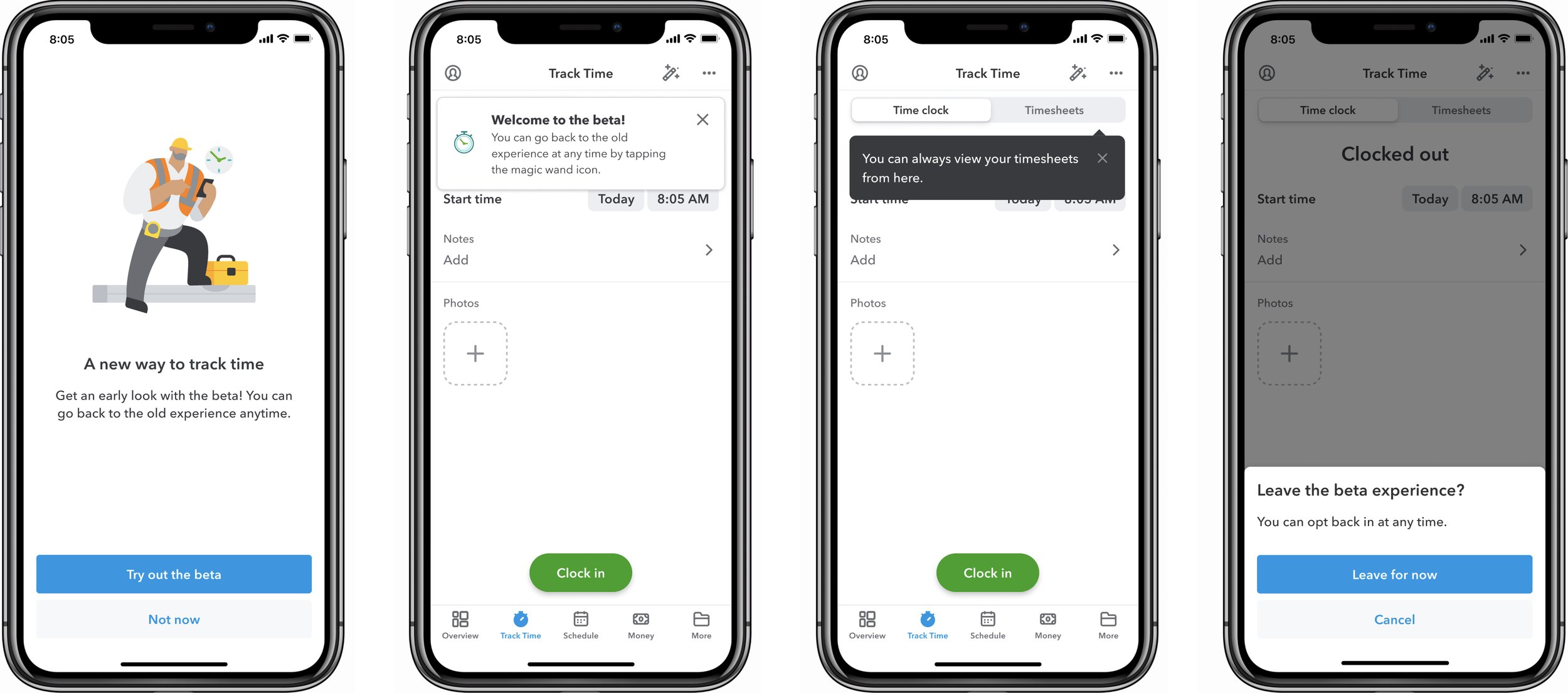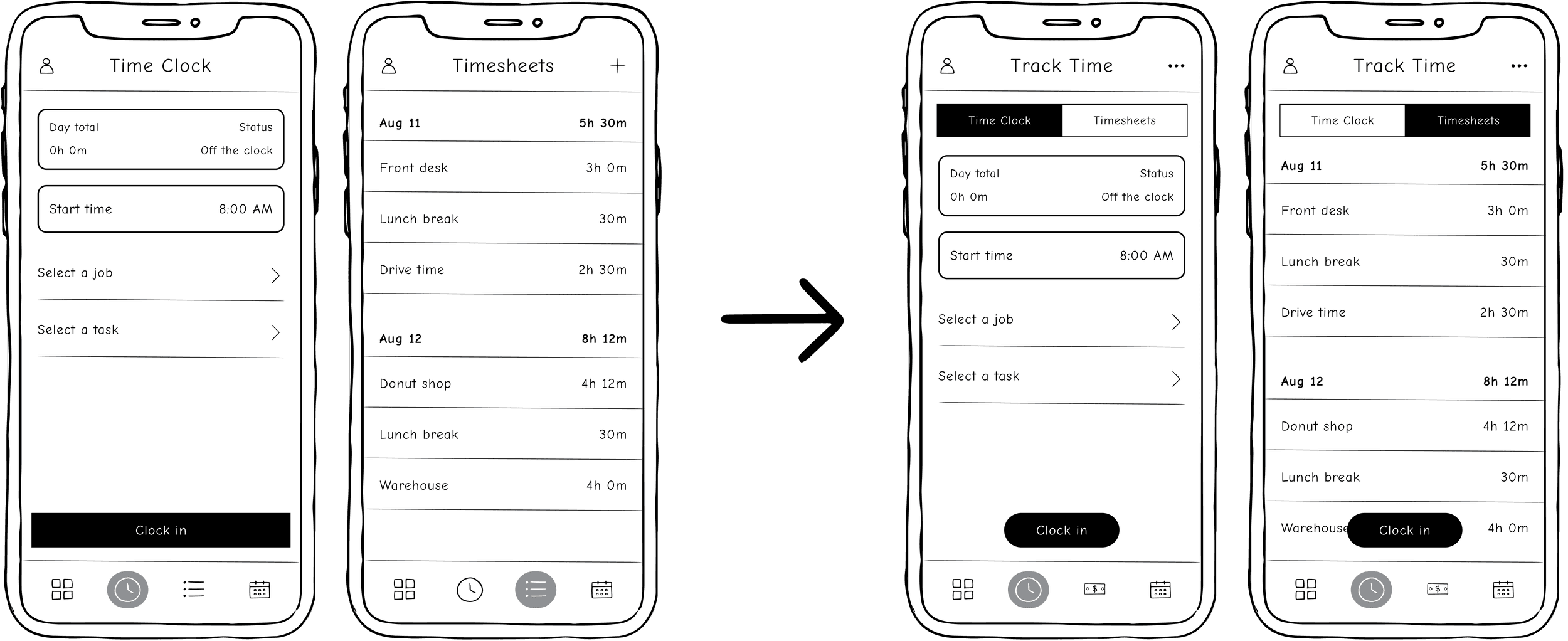 During those same research sessions, we also tested a change to the navigation. Previously, Time Clock and Timesheets were separate tabs in the bottom navigation. As we added more features to the app, it became increasingly difficult to decide which items should be in the first four tabs and which ones should be tucked away in the "More" menu.