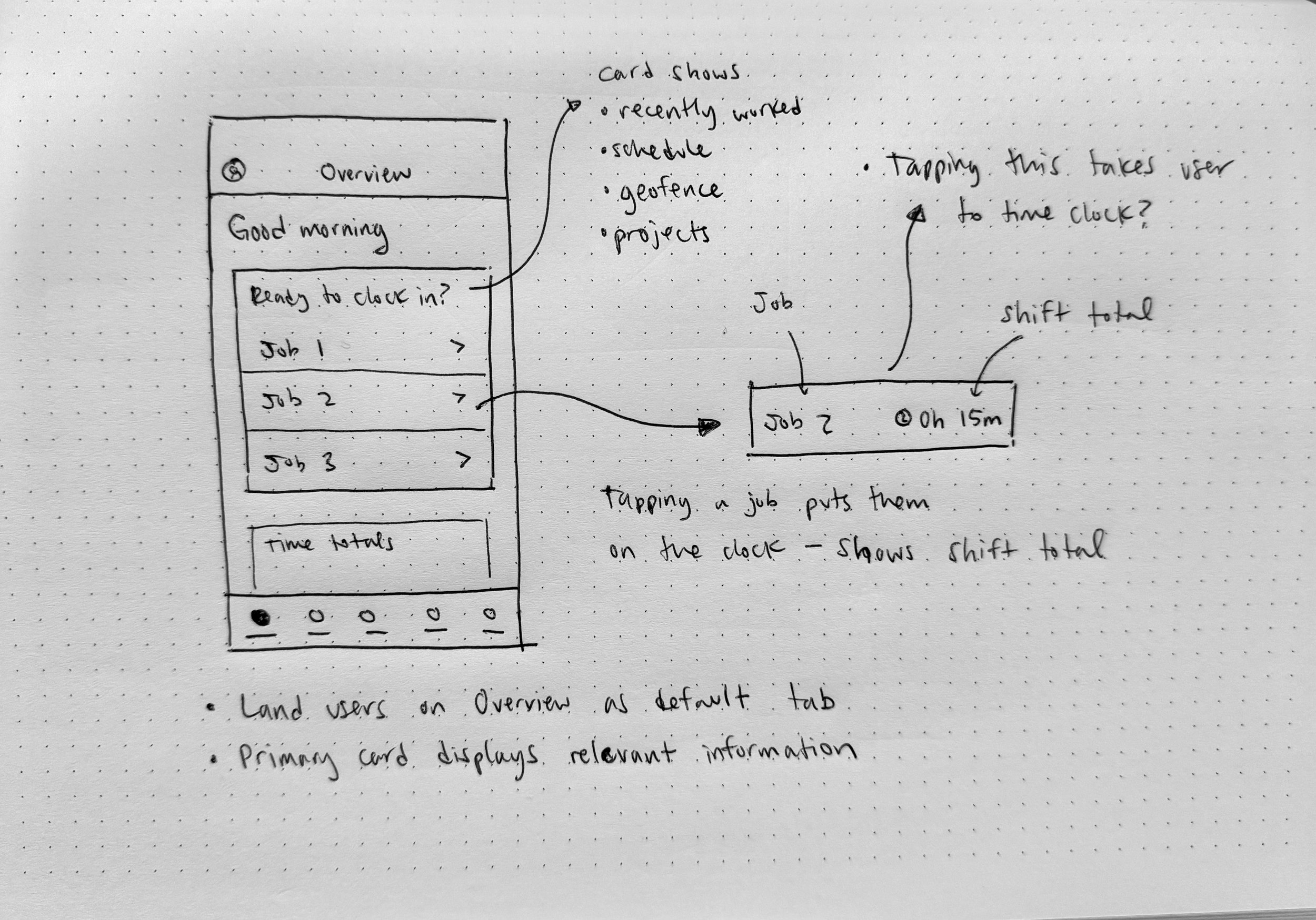 We realized we needed a user experience that prioritized quick clock-ins and centralized the various methods for tracking time. Over two sprints (4 weeks), we tested four different concepts through 20 unmoderated tests and 12 in-person, moderated studies: