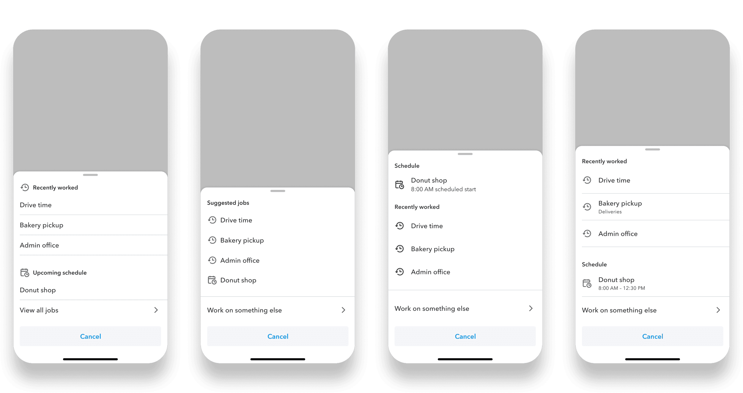 While our team had a clear design direction, we needed to refine the interaction flow for clocking in. Questions remained about the bottom sheet’s appearance and the arrangement of its elements. Through 30 unmoderated A/B tests and 6 interviews with current QuickBooks users, the new bottom sheet design took shape. We discovered that pairing icons significantly improved glanceability and helped us correctly order the various clock-in methods. Here's a look at the evolution of the drawer: