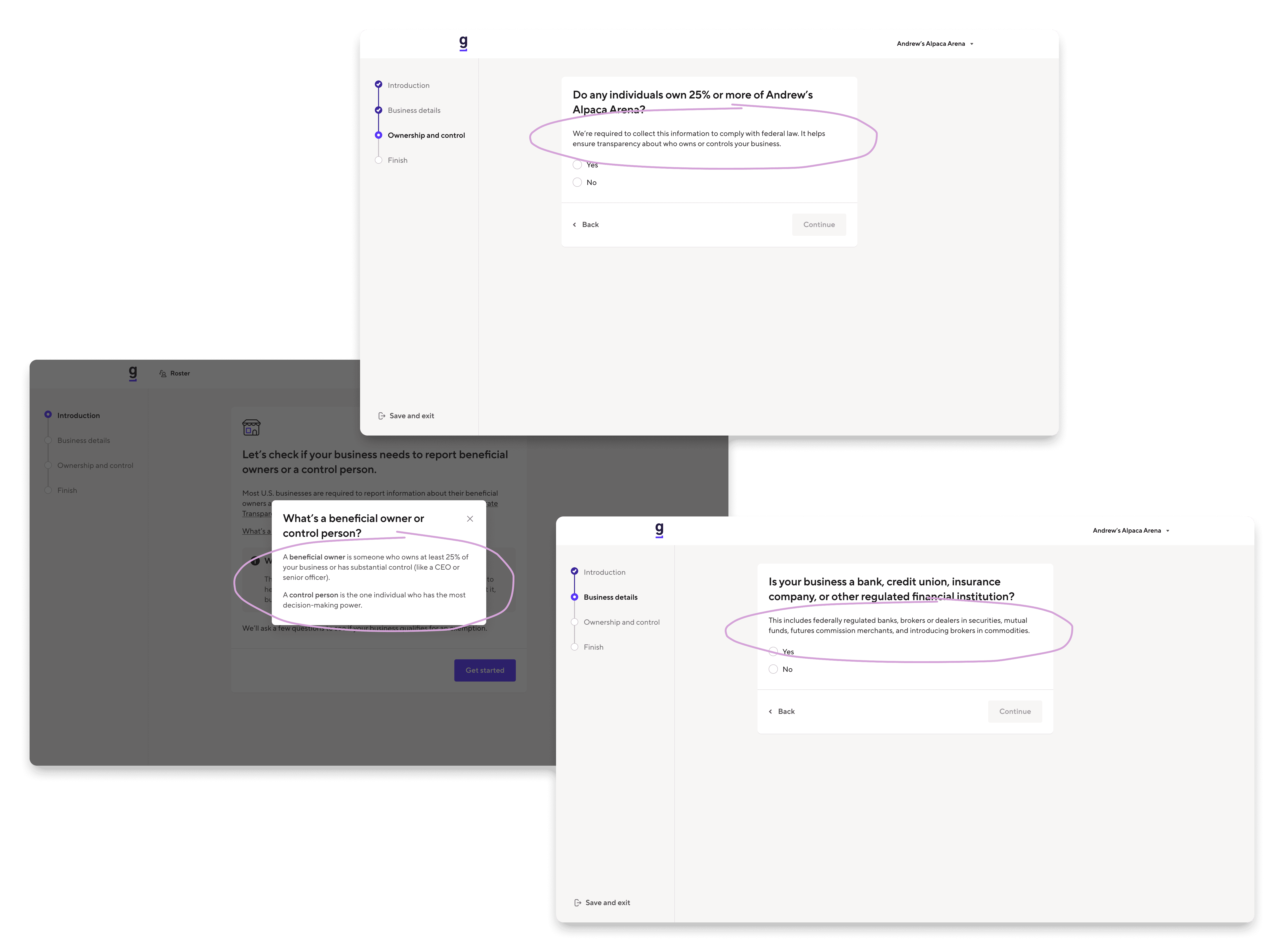 I led the design of an ownership verification experience to meet new FinCEN AML (anti-money laundering) requirements, balancing strict regulatory compliance with onboarding conversion through research-driven strategy and cross-functional alignment.